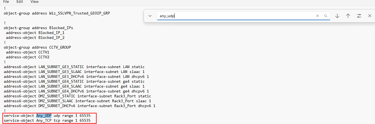 So when we deleted these two Any_UDP and Any_TCP service-objects, we could see that the third service-object couldn't be created, which shows that none of the service-objects could be created.