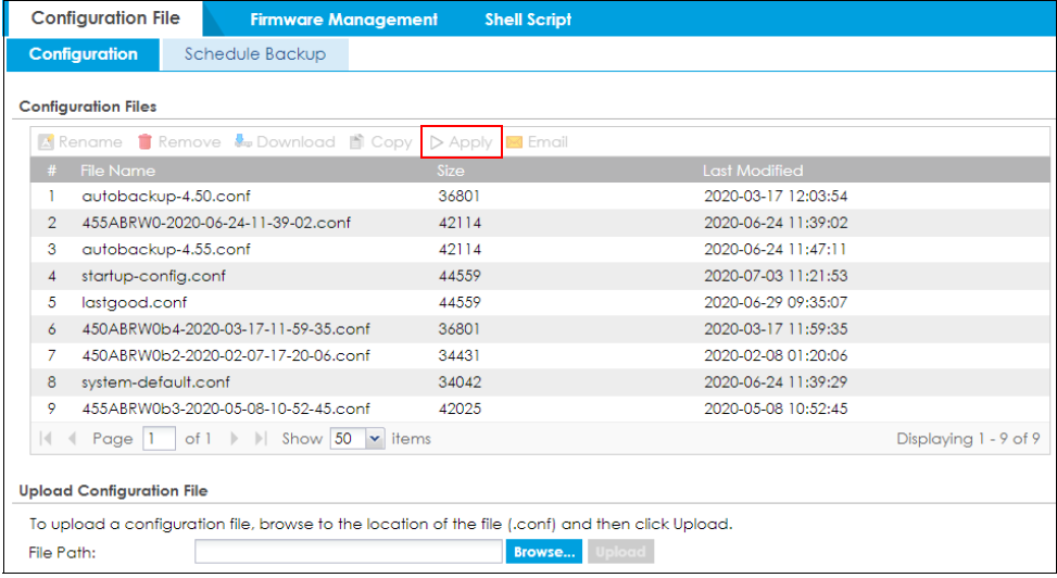 Then select the newly uploaded configuration file by left-clicking on it and then click "Apply"