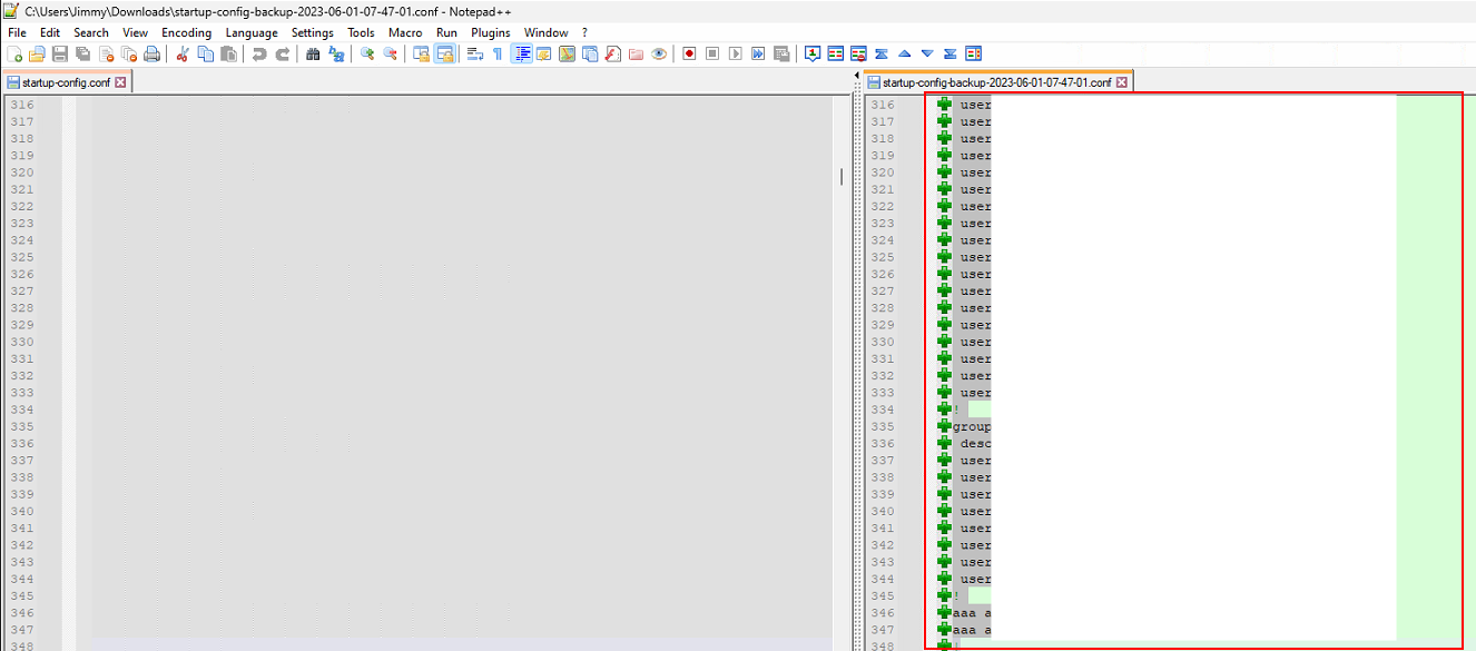 When copy and pasting a configuration file manually, try to find similarities of where some configuration sections are beginning and ending. You can also see the green fields in Notepad++ of what new configuration that's not in the current configuration file.