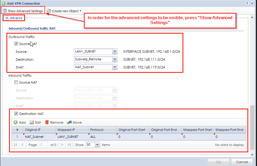 6. Scroll to the end of the page and open the "Advance"-arrow to configure the “Inbound/Outbound traffic NAT” section (In order for the advanced settings to be visible, press "Show Advanced Settings"). Tick the “Source NAT” checkbox, choose your "real" local subnet as your “Source”, the remote subnet as your “Destination” and the “fake” subnet for the “SNAT”