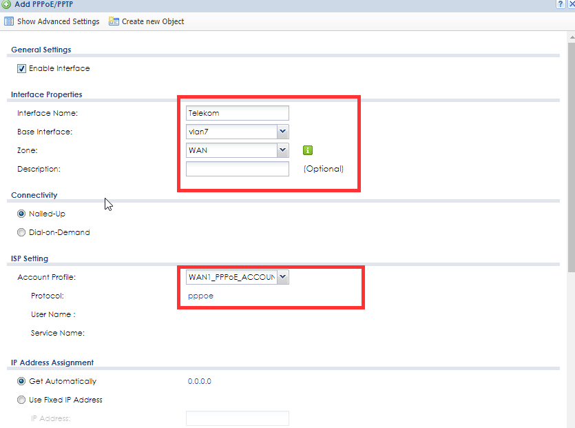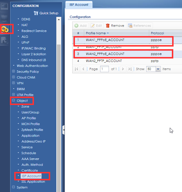 To do some pre-configurations we will set up the ISP accounts. Therefore please go to Configuration > Object > ISP Account and add or use one of the existing PPPoE accounts to enter your ISP's credentials. Please repeat this for the second connection.