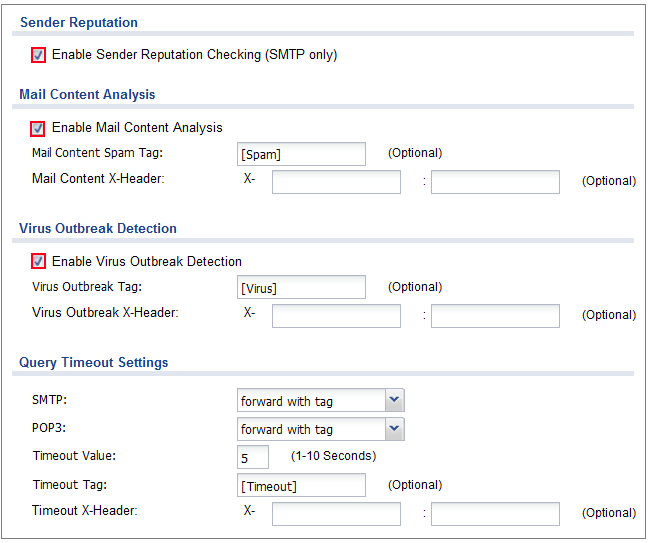 2. In the ZyWALL/USG, go to CONFIGURATION > UTM Profile > Anti-Spam> Mail Scan. Select Enable Sender Reputation Checking (SMTP only) to have the ZyWALL/USG scan for spam e-mail by IP Reputation. Select Enable Mail Content Analysis to identify Spam Email by content, such as malicious content. Select Enable Virus Outbreak Detection to scan viruses attached in emails. Leave Query Timeout Settings to be the default settings. Click Apply.