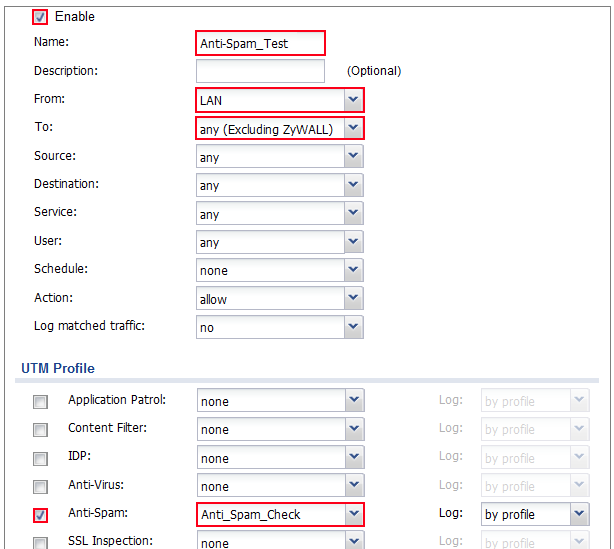 CONFIGURATION > UTM Profile > Anti-Spam> Profile > Profile Management > Add rule