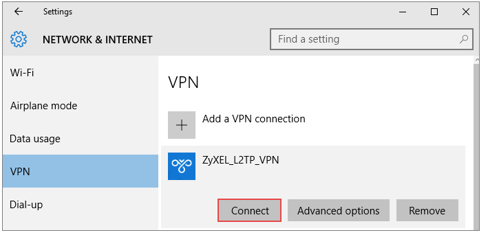 To configure L2TP VPN in Windows 10 operating system, go to Start > Settings > Network & Internet > VPN > Add a VPN Connection and configure as follows.