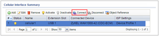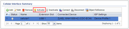 2. On the ZyWALL/USG, the connected device will automatically display in the Cellular Interface Summary. Click "Activate" and then the "Apply" button at the bottom of this page.