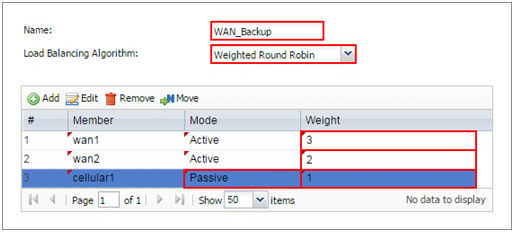 Add wan1 and enter 3 in the Weight column. Add wan2 and enter 2 in the Weight column. Add cellular1, change Mode to be the Passive mode, enter 1 in the Weight column. Click OK to return to the configuration screen.
