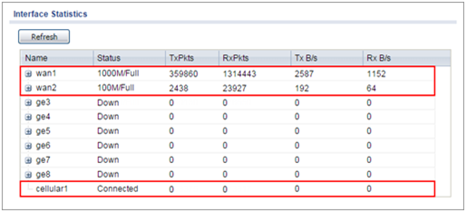 1. Check the Interface Statistics when wan1 and wan2 connections are up. You can see both wan1 and wan2 Status are up, Tx B/s displays the transmission speed and Rx B/s displays the reception speed; cellular1 Status is connected but there is no traffic going through this interface.