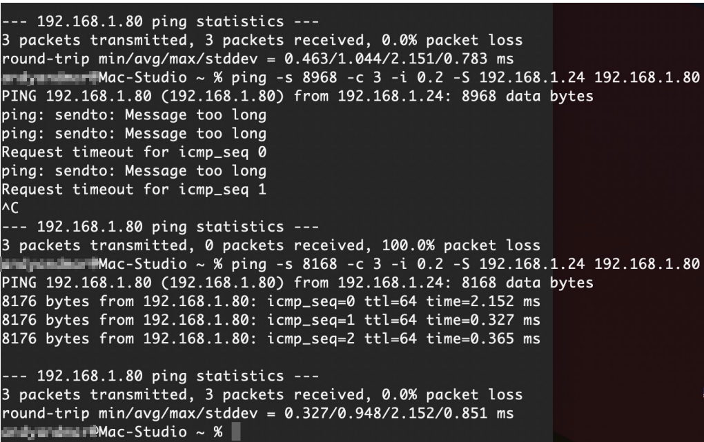 Even with MTU set to 9000 in macOS, packets larger than ~8968 bytes were dropped.