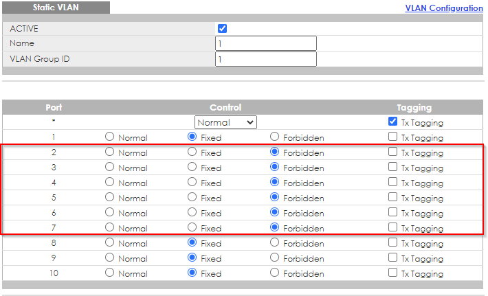 - Select ports 2, 3, and 4 as Fixed and no tag is needed. All other ports switch to "Forbidden".