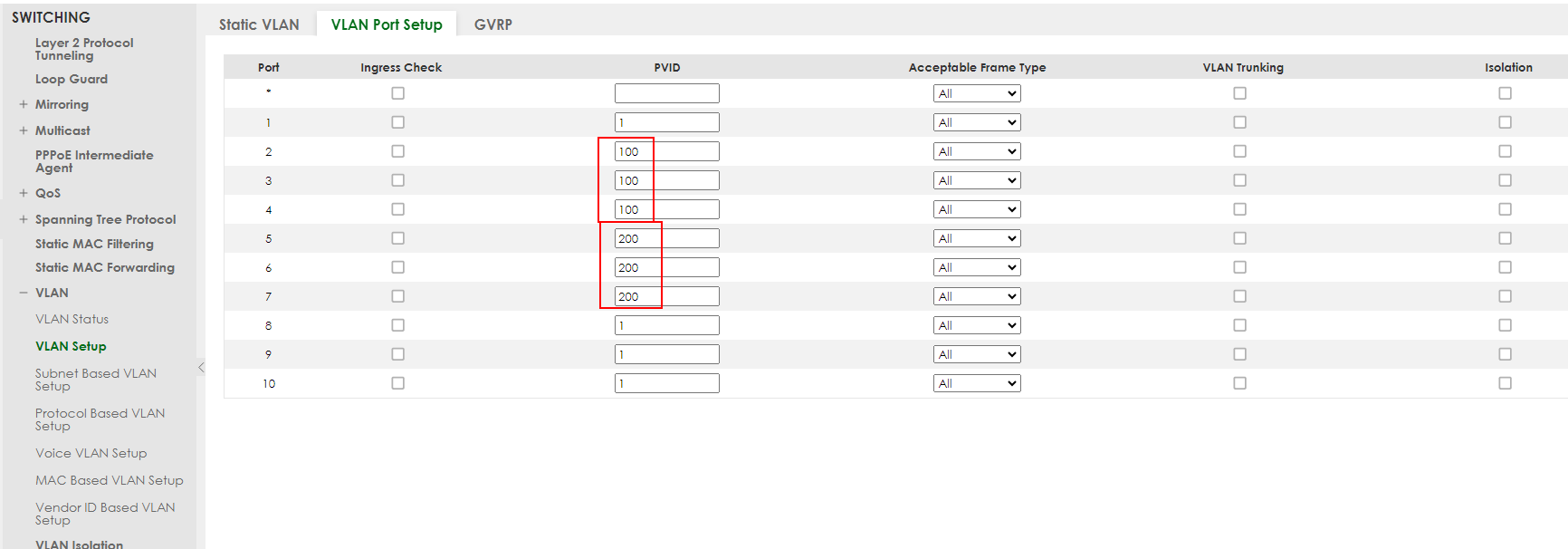 - Set port 2,3,4 as PVID=100 (VLAN 100) and port 5,6,7 as PVID=200 (VLAN 200).