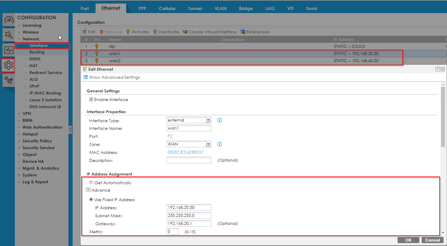 Now we need to configure WAN1 and WAN2 on our firewall. Since our firewalls work in HA Pro mode, all settings need to be done only on the active device. Then the settings are automatically copied to the passive device. Depending on how your ISP will issue an IP address, static or by DHCP, you will need to make the appropriate settings. In our case, we have static IP addresses.