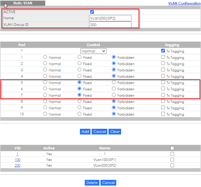 - Check the "Tx Tagging" box for ports 5, 6, and 7 (ISP2 and firewall connection).