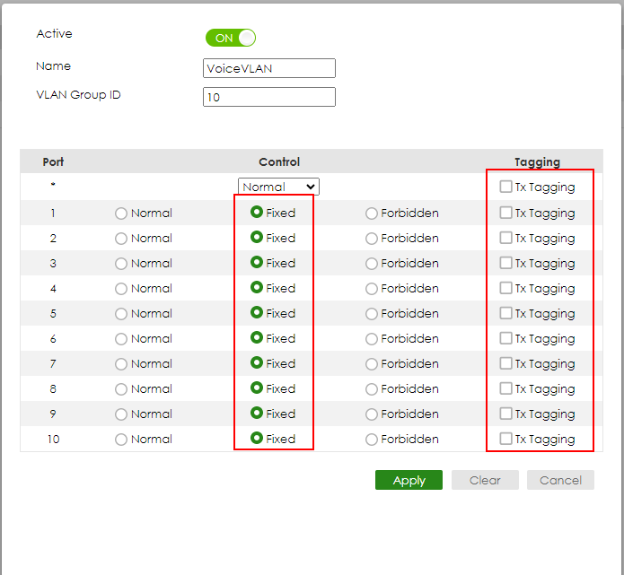 c. If the IP Phone is VLAN disabled: The Switch will assign the Voice VLAN and priority setting to the IP phone’s VOIP traffic. This setting causes the IP Phone to only send and receive untagged traffic. In this case, port 1 in VLAN 100 on Switch should be set as untagged out (uncheck the TX tagging box).