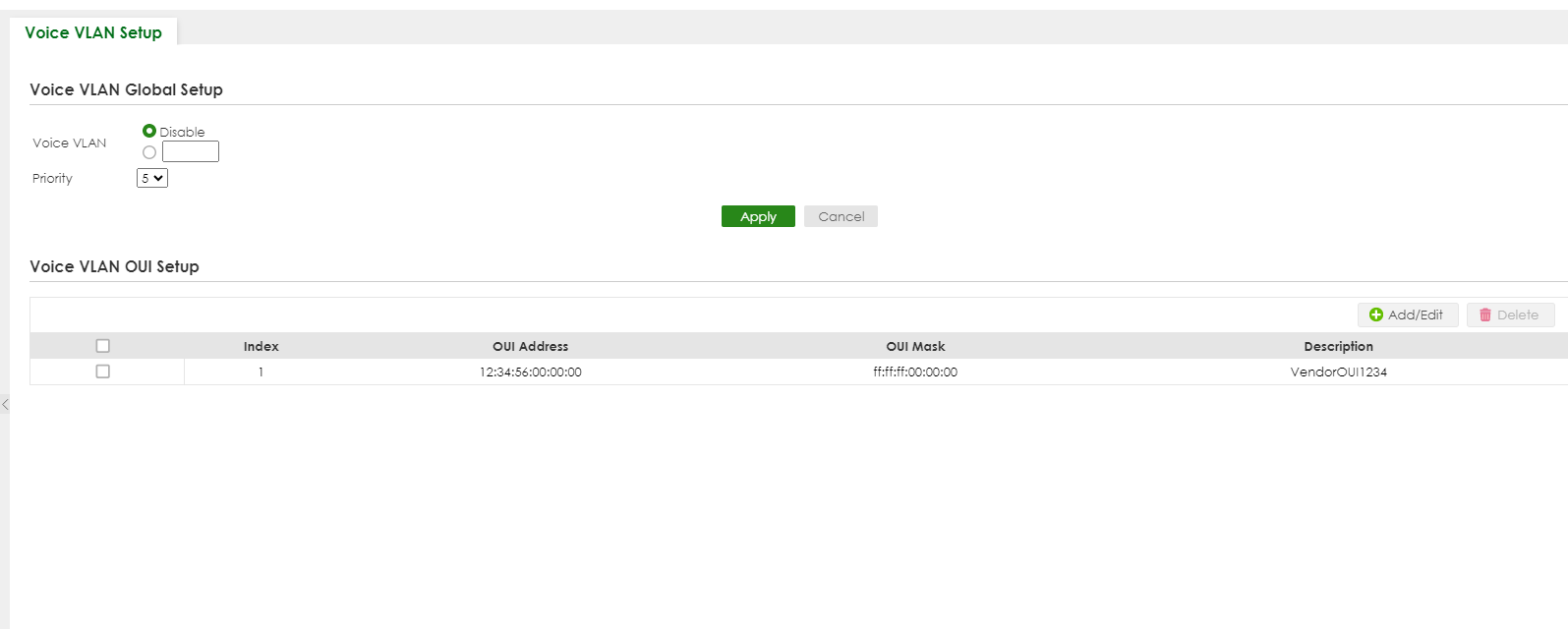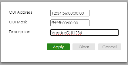 Specify the OUI addresses. OUI are the first 3 bytes of a MAC address that represents the vendor. By specifying the IP phone MAC address, the switch can identify voice traffic accordingly. Zyxel switch supports up to 6 vendor OUIs.