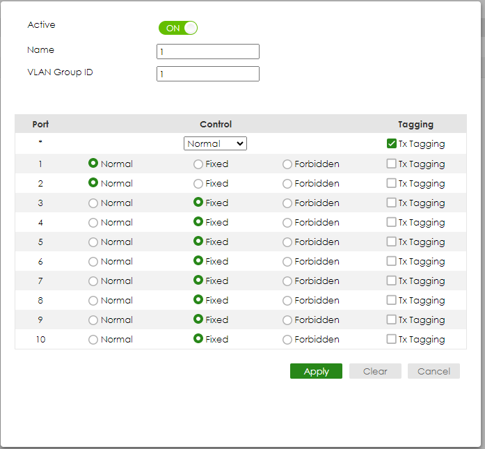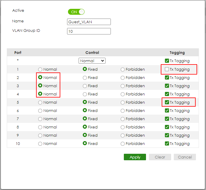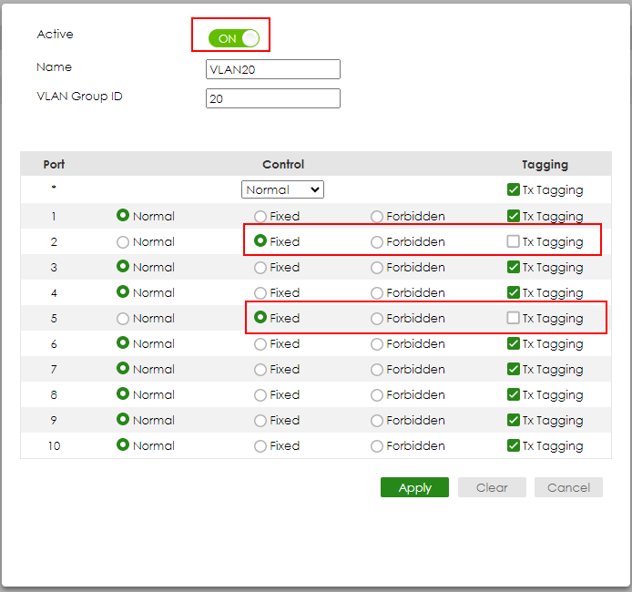 Check the “ACTIVE” Type the Name and VLAN Group ID=10. Select port 1, 5 as Fixed and uncheck Tx Tagging (Untagged) on port 1 and check Tx Tagging (Tagged) on port 5. Click “Apply”.