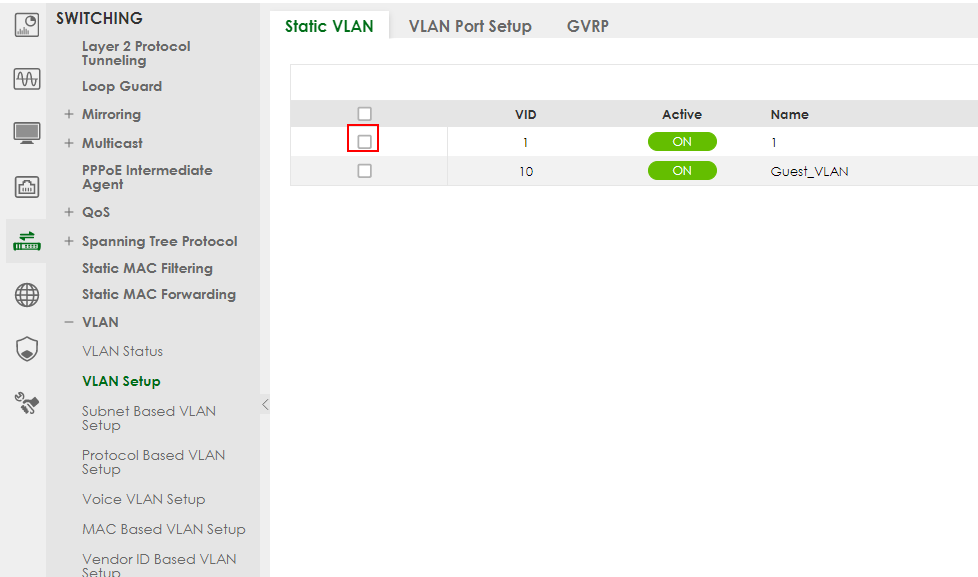 SWITCHING > VLAN > VLAN Setup > Static VLAN