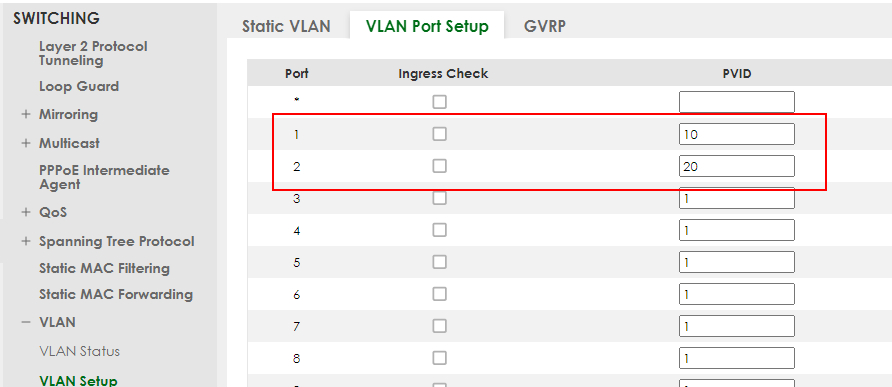 Set port 1 as PVID=10 (VLAN 10) and port 2 as PVID=20 (VLAN 20).
