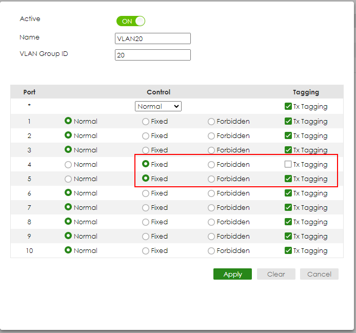 Check the “ACTIVE” Type the Name and VLAN Group ID=20. Select port 4, 5 as Fixed and uncheck Tx Tagging (Untagged) on port 4 and check Tx Tagging (Tagged) on port