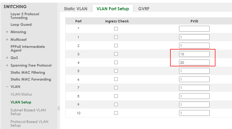 Set port 3 as PVID=10 (VLAN 10) and port 4 as PVID=20.