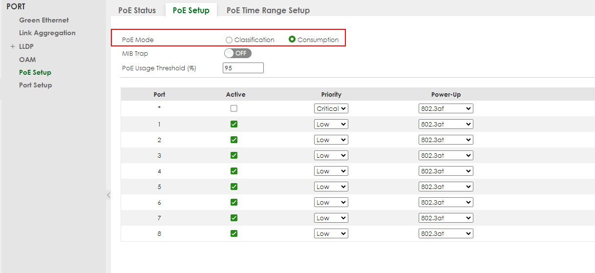 3. The PoE-Mode is set to Classification by default. Change this to Consumption mode and apply/save this configuration.