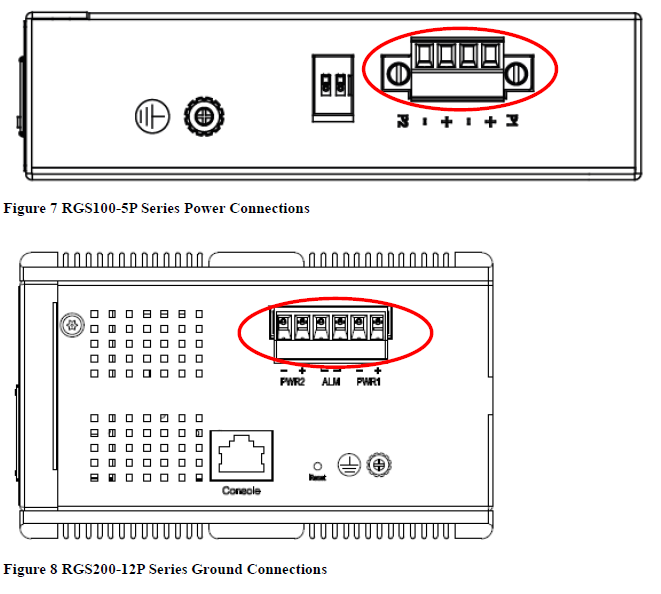 The DC Power interface is a 6-pin terminal block with polarity signs in the top panel. The RGS200-12P can be powered from 2 power suppl (input range 12V - 58 V). The DC power connector is a 6-pin terminal block; there is alarm contact on the middle terminal block.