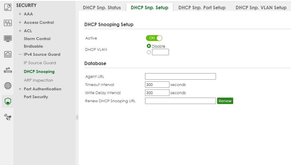 SECURITY > IPv4 Source Guard > DHCP Snooping > DHCP Snp. Setup