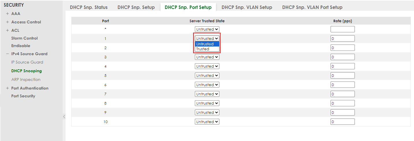 SECURITY > IPv4 Source Guard > DHCP Snooping > DHCP Snp. Port Setup
