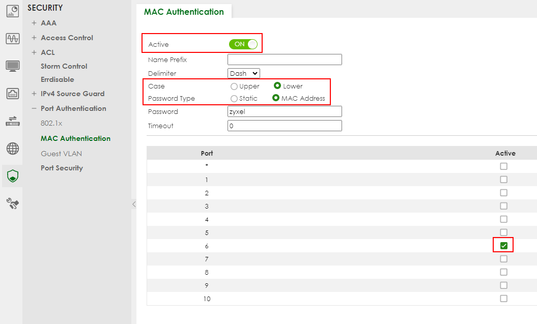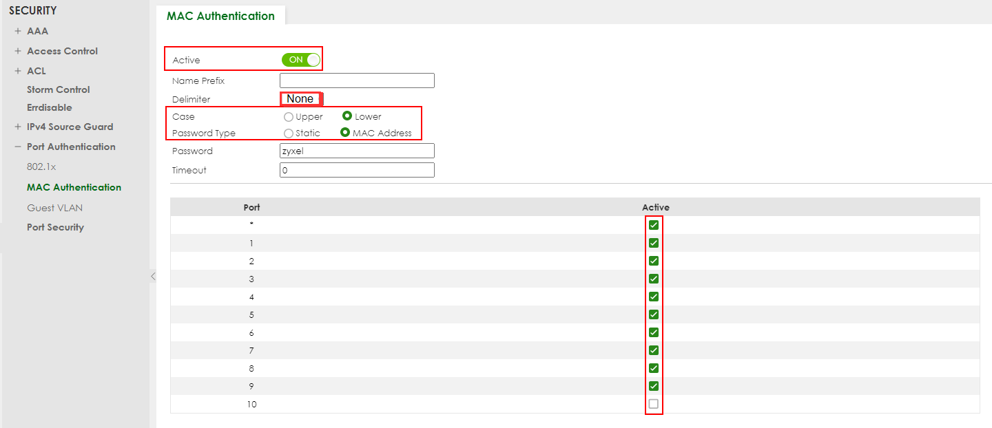 Then activate MAC Authentication, choose a MAC-address-based lowercase password type, and activate the MAC Authentication on the ports you'd like. Change the dash on the switch to none.