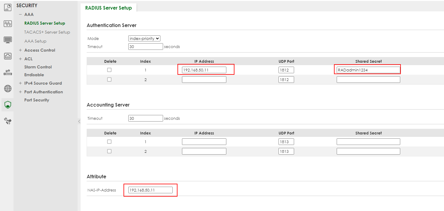 - Refer to Nr 6 NPS setting is Shared Secret => Set IP and enter a RADIUS Shared Secret.