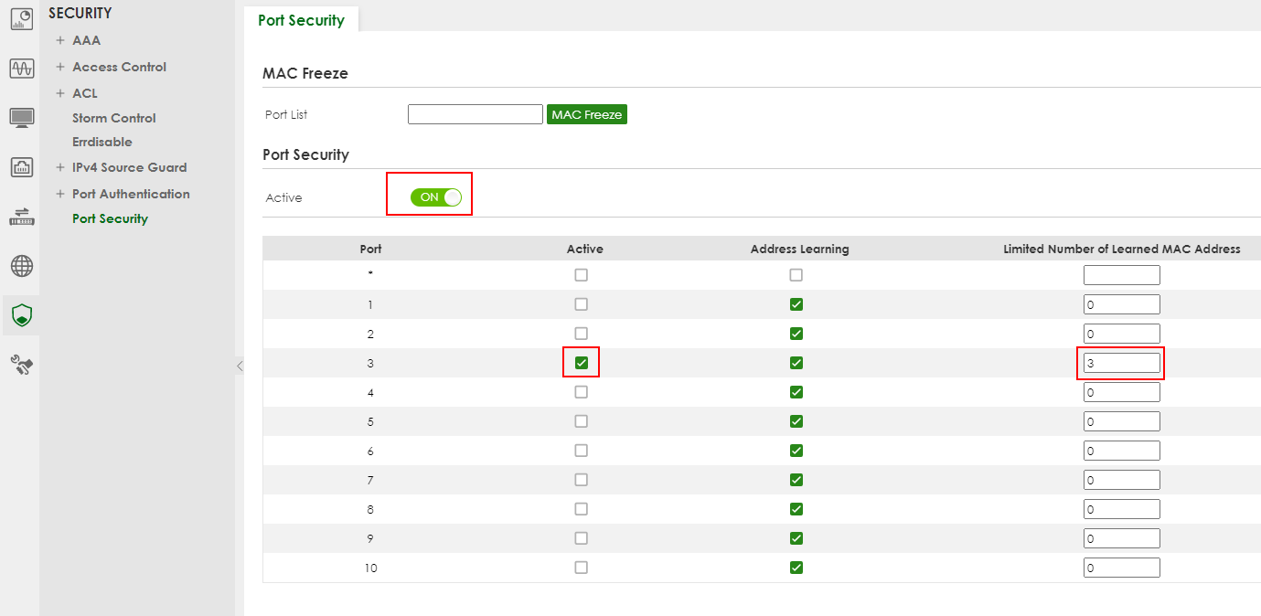 Check port 3 and set the “Limited Number of Learned MAC Address” to 3.
