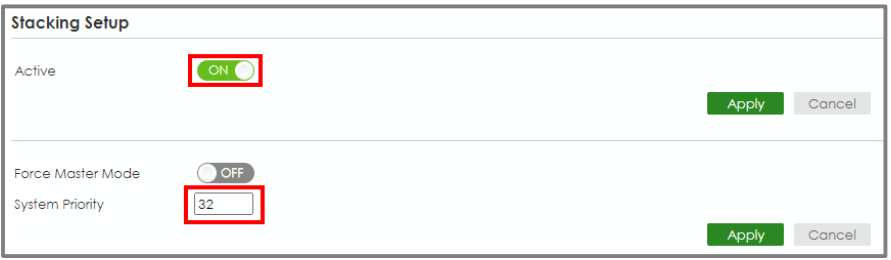 Enter the web GUI and go to Menu > System >Stacking > Stacking Setup. Key in the system priority (The higher the number is, the higher priority it is to become a master) and click “Apply”. Enable the Active setting and click “Apply”.