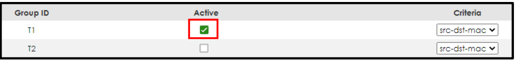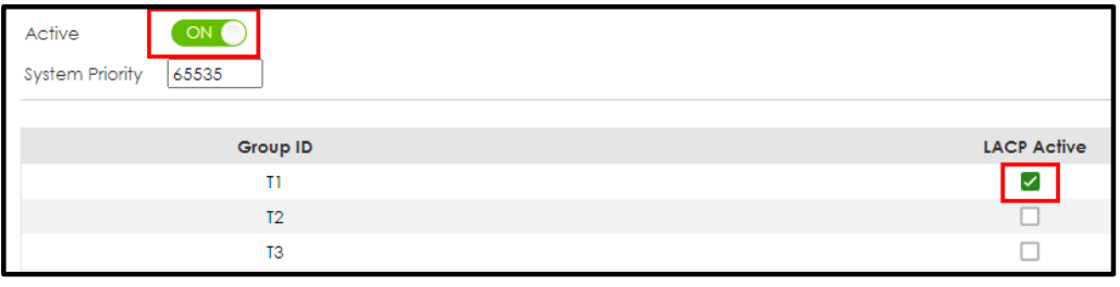 - Go to Menu > Advanced Application > Link Aggregation > Link Aggregation Setting >LACP. Check the “Active” box, as well as for T1 and T2.