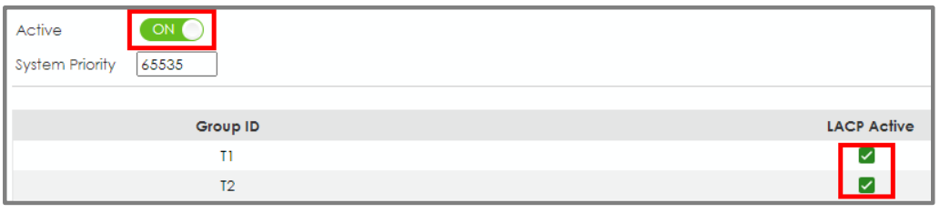 Go to Menu > Port > Link Aggregation > Link Aggregation Control Protocol. Check the “Active” box, as well as for T1 and T2.