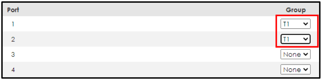 Select SLOT 2 and set the Group of port 2/1 and 2/2 as T1 and T2 respectively. Click “Apply”.