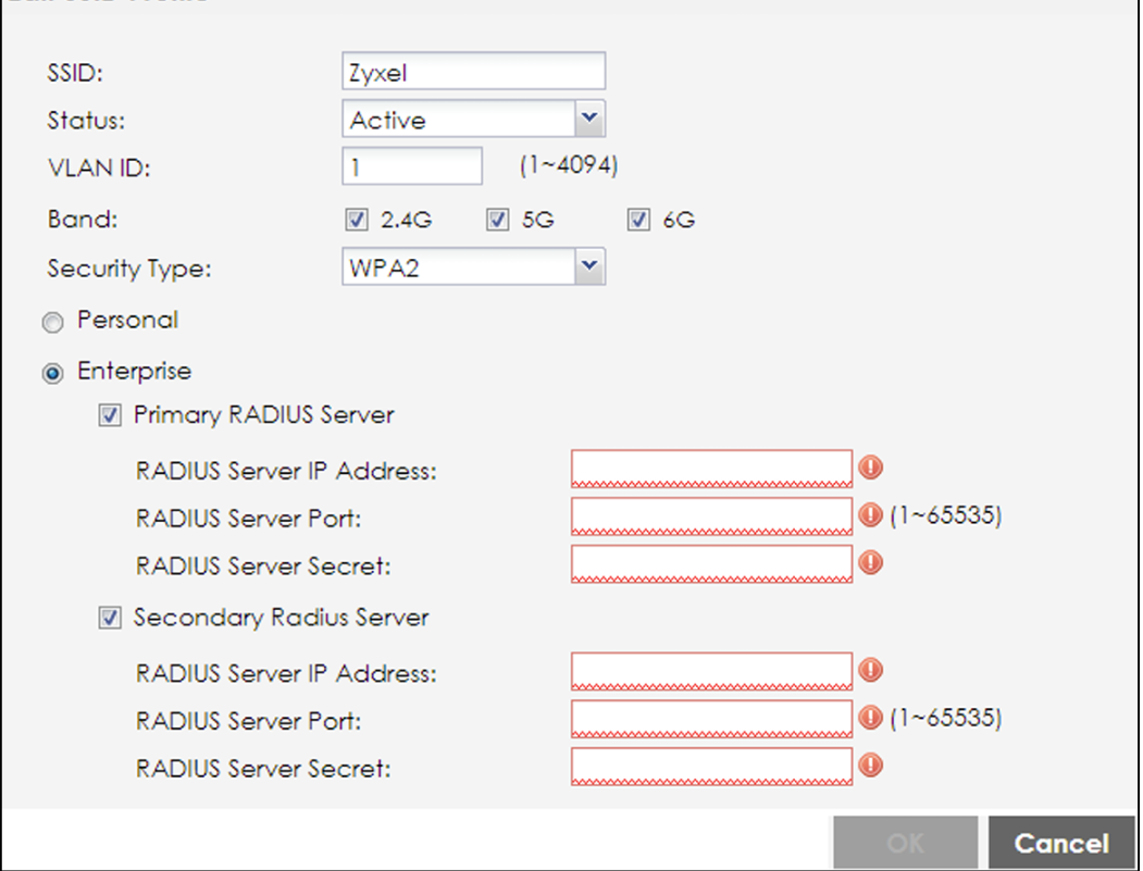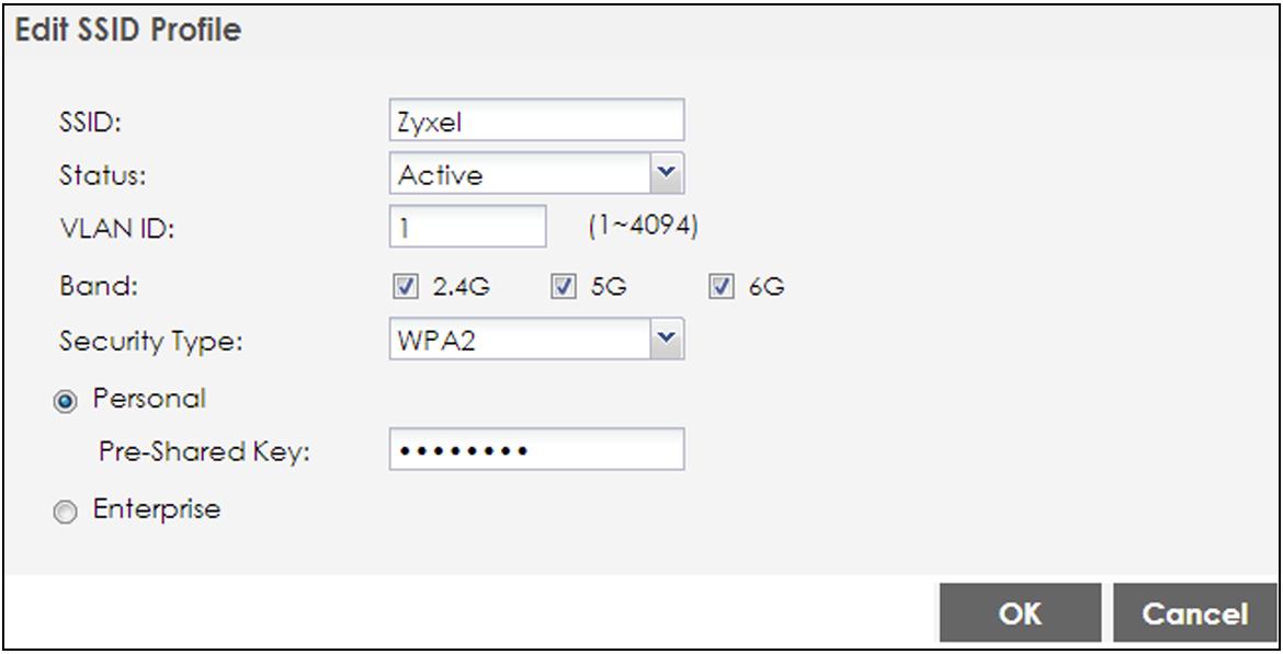 Use this screen to enable, disable or edit an SSID profile. An SSID profile is a configuration template for SSID (Service Set IDentifier). It allows you to configure the SSID settings such as WiFi network name, VLAN ID, frequency band and security. You can configure multiple SSID profiles to provide different network access for various user groups.