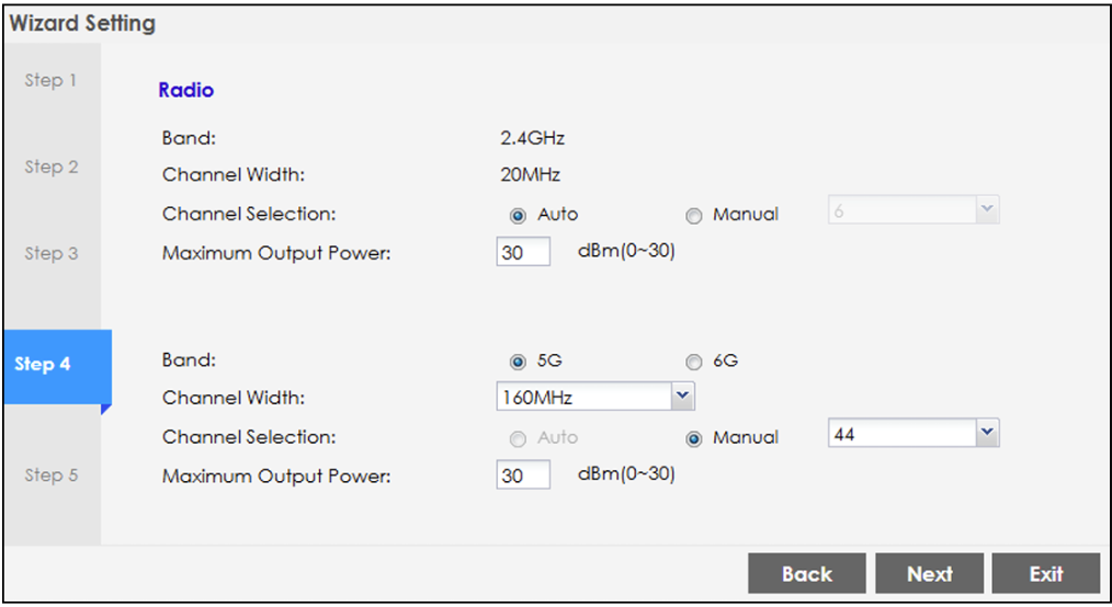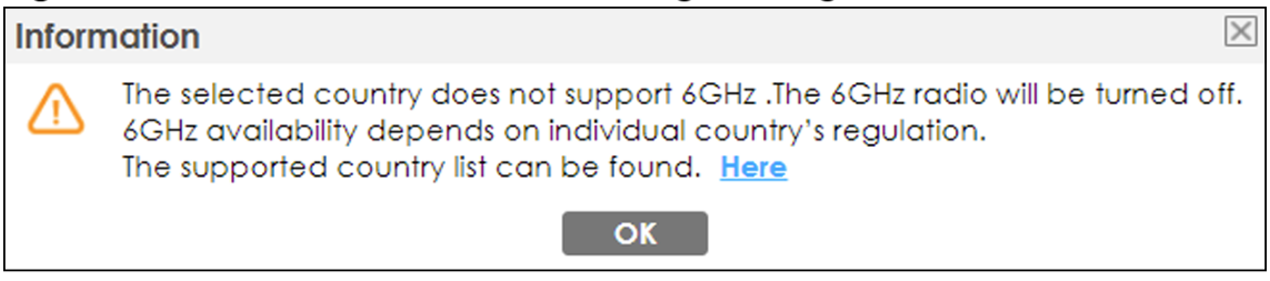 If the Country you select in Step 1 does not support 6 GHz, the 6G option will gray out, or a warning message will display when you select 6G. Click OK to return to the previous page.