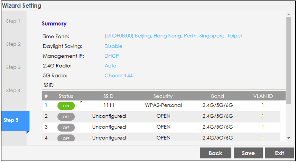Use this screen to check whether what you have configured is correct. Click Save to apply your settings and complete the wizard setup. Otherwise, click Back to return to the previous screen or click Exit to close the wizard without saving.
