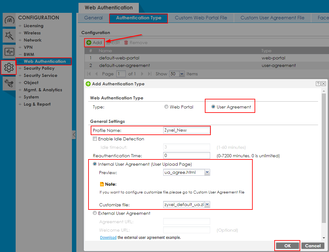 - In the “Authentication Type” profile, you must select the “User Agreement” type fill in the profile name, and choose the “Internal User Agreement (User Upload Page)” type. Then the customized file is selected yourself zip file