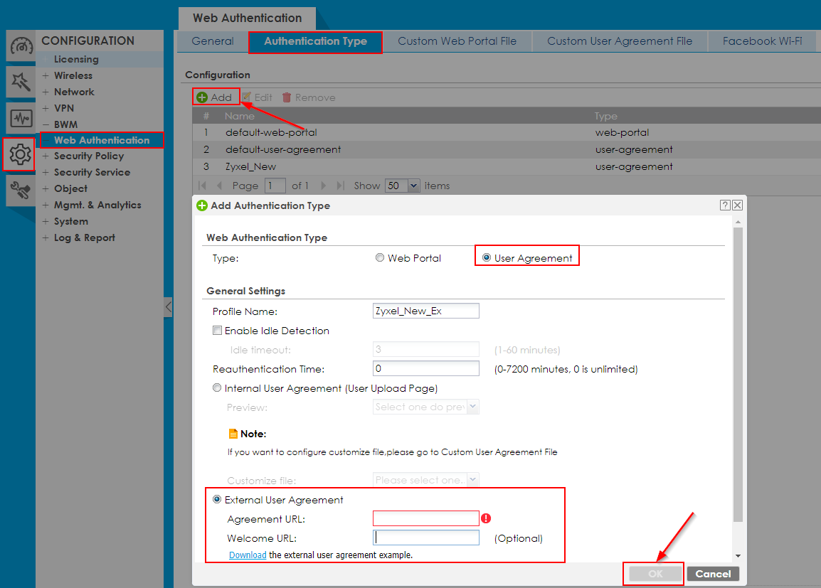 - In the “Authentication Type” profile, you must select the “User Agreement” type fill in the profile name, and choose the “External User Agreement” type. Then fill in your UA portal page’s URL format.