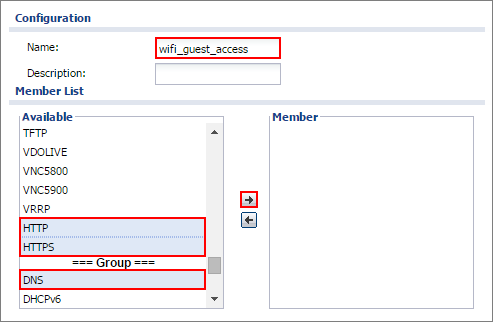 3. In the ZyWALL/USG, go to CONFIGURATION > Object > Service > Service Group. Click Add to create a Service Group Rule that allowed protocols for guest Wi-Fi user. Configure the Name for you to identify the Service Group. Set HTTP, HTTPS and DNS to be in the same member group and click OK.