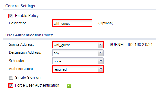 - In the ZyWALL/USG, go to CONFIGURATION > Web Authentication > Web Authentication Policy Summary. Click Add to configure policy to redirect HTTP traffic to the user login screen. Configure the Description (Optional) for you to identify the auth. Policy. Then, scroll down the Source Address list to choose the newly created wifi-guest. Set the Authentication to be required. Select Force User Authentication.