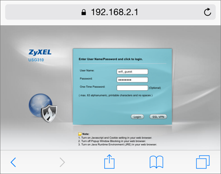 - Using a mobile device to connect to the AP which is connected to the ZyWALL/USG. When you try to access the Internet, it will redirect to the user login screen.