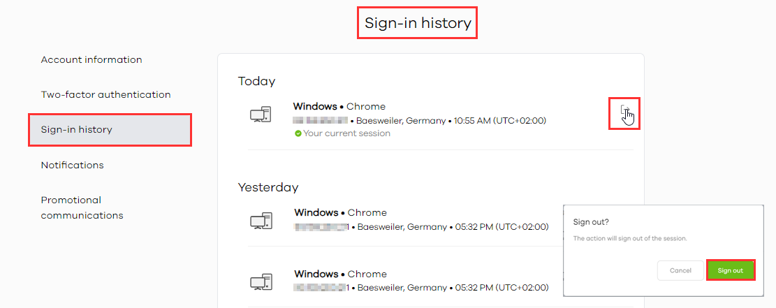 Sign-in history - on this page you can check the login history and log the user out if necessary