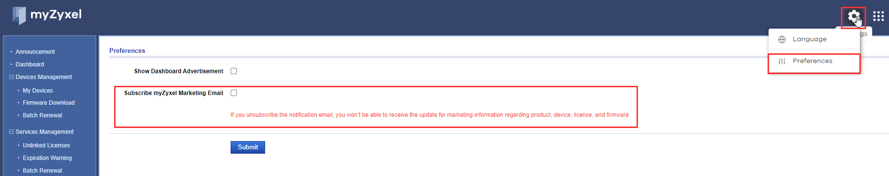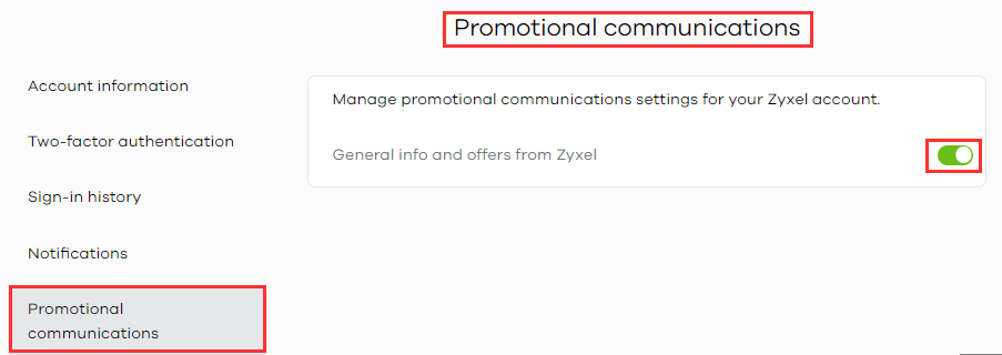 Promotional communications are the same as Subscribe myZyxel Marketing Email under “Preferences” at https://portal.myzyxel.com.