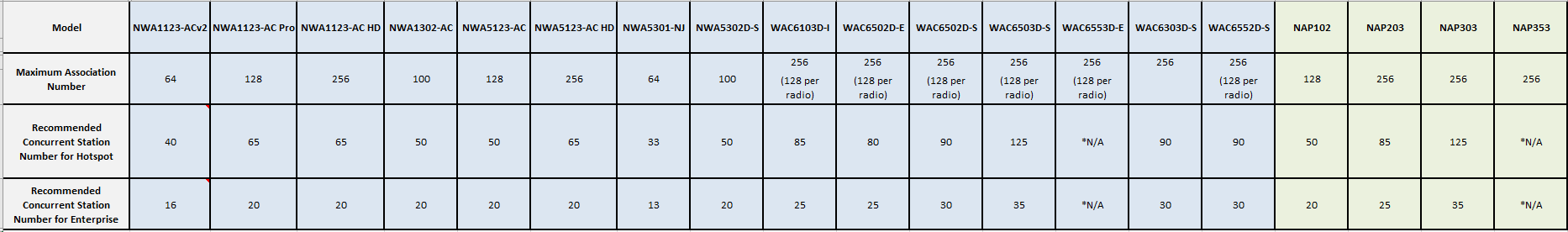 Here are the statistics for maximum association number, recommended concurrent station number for Hotspots, and recommended concurrent station number for Enterprise.